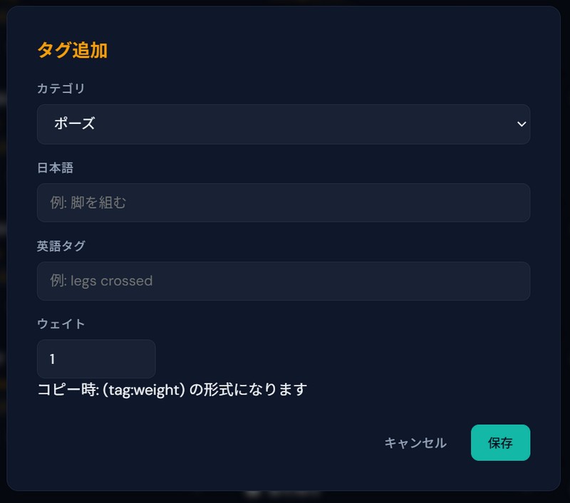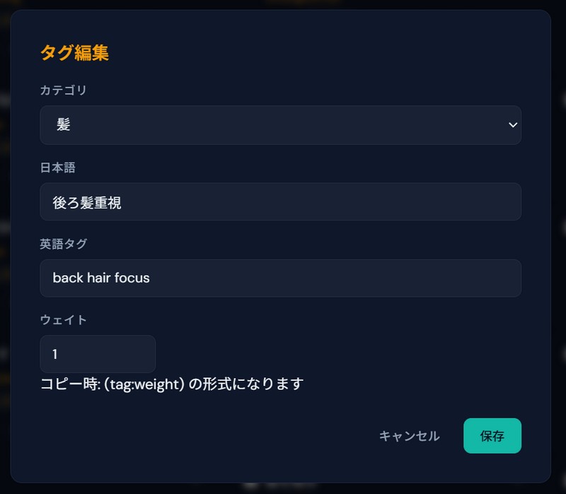 Bilingual search (Japanese/English): Each tag is registered with both a Japanese label and an English tag. Searching for “髪が揺れる” or “hair swaying” leads to the same entry. This is especially useful for users who think in Japanese but need English-language prompts.