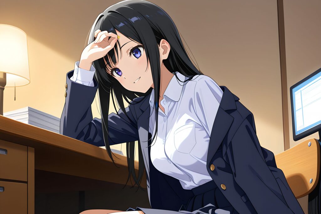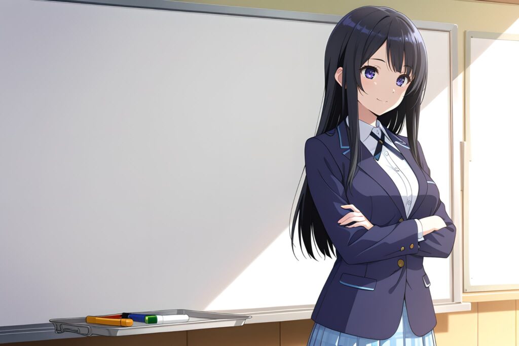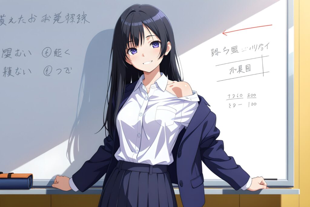 しかし、これだけ設定してもはだけさせてきました。プロンプトの力だけではブレザーの前を閉じさせることができない場合があるようです。これはモデルによると思われますが、プロンプト制御の限界を感じた瞬間でした。
