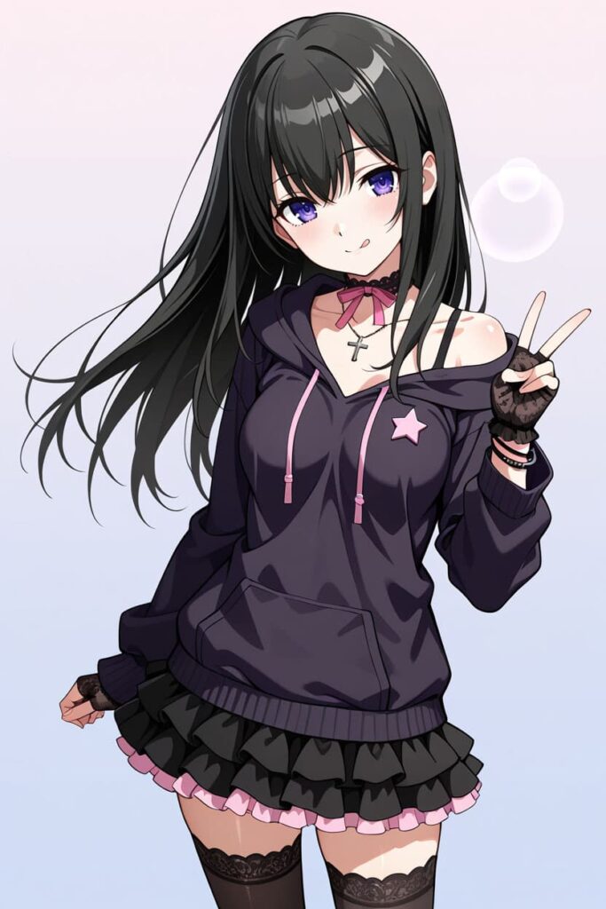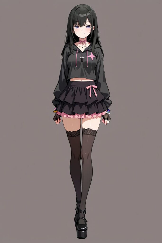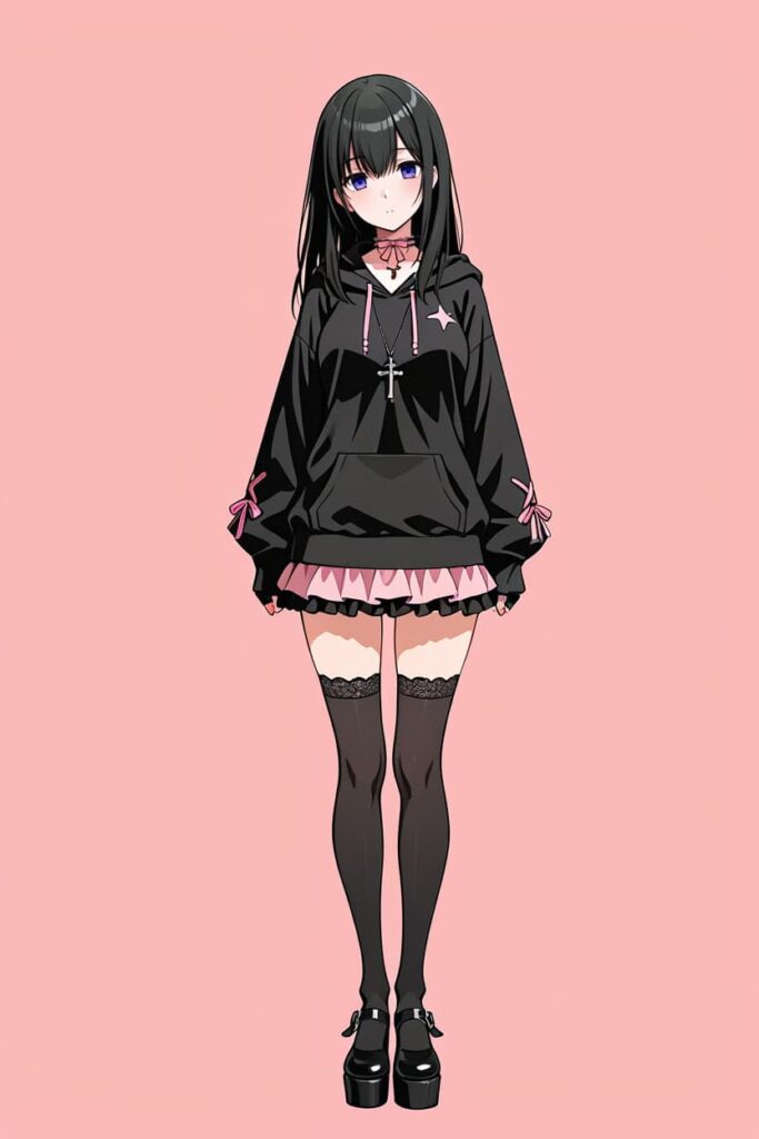 参照画像として用意したのは、ピンクの星マークが入った黒のオーバーサイズパーカー、ピンクのリボンチョーカーに十字架ネックレス、パーカーの裾から覗くピンクのフリルスカート、レーストップのニーハイソックスに厚底シューズ──いわゆる典型的な地雷系コーディネートの女の子です。