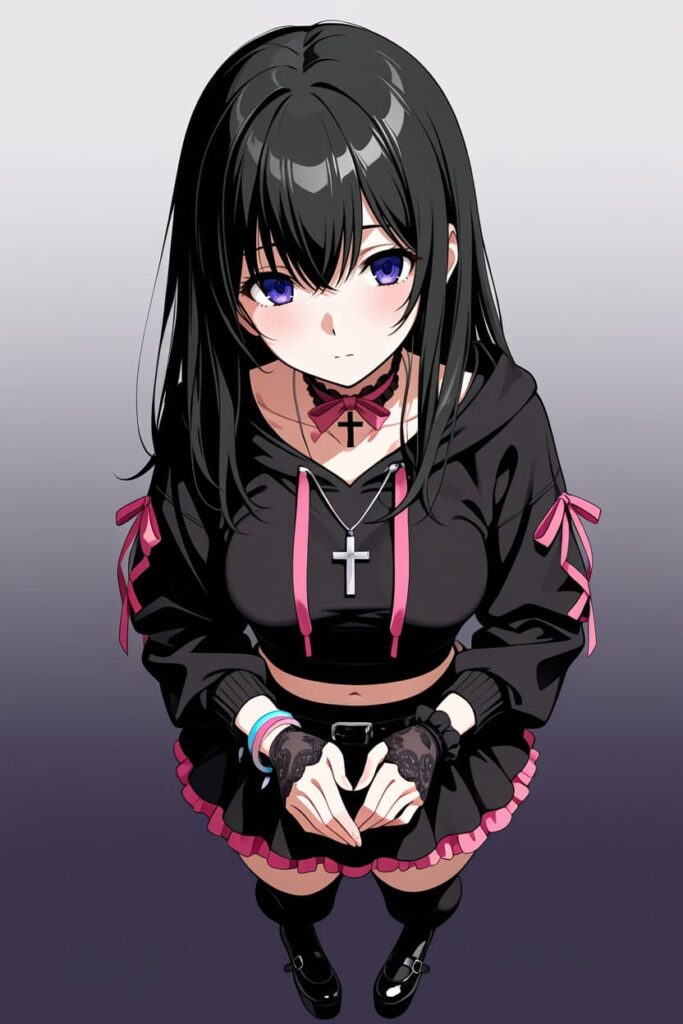 「地雷系の雰囲気」は拾えていました。 これは正確に書いておくべきことです。生成結果を見ると、黒基調の服、ピンクのアクセント、十字架モチーフ、ゴシック調の装飾──「地雷系コーデの女の子」という大枠の方向性は、どの生成結果にもちゃんと反映されています。CLIPは「地雷系っぽさ」というスタイルレベルの情報はしっかり拾っていました。