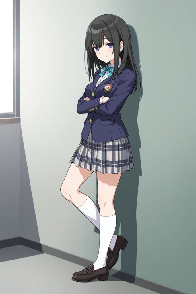 【経験則】ブレザー制服に変更したことで、シルエットと基本配色の安定性は大幅に向上しました。地雷系のときの「スタイルは合っているが毎回違うデザインになる」状態からは明確に改善されています。しかし、チェック柄のパターンや細部のディテール(ボタン数、襟の形、リボンタイの形状)は生成ごとにブレが残ります。「近しいものが出る」と「同じものが出る」は、似ているようで全然違います。